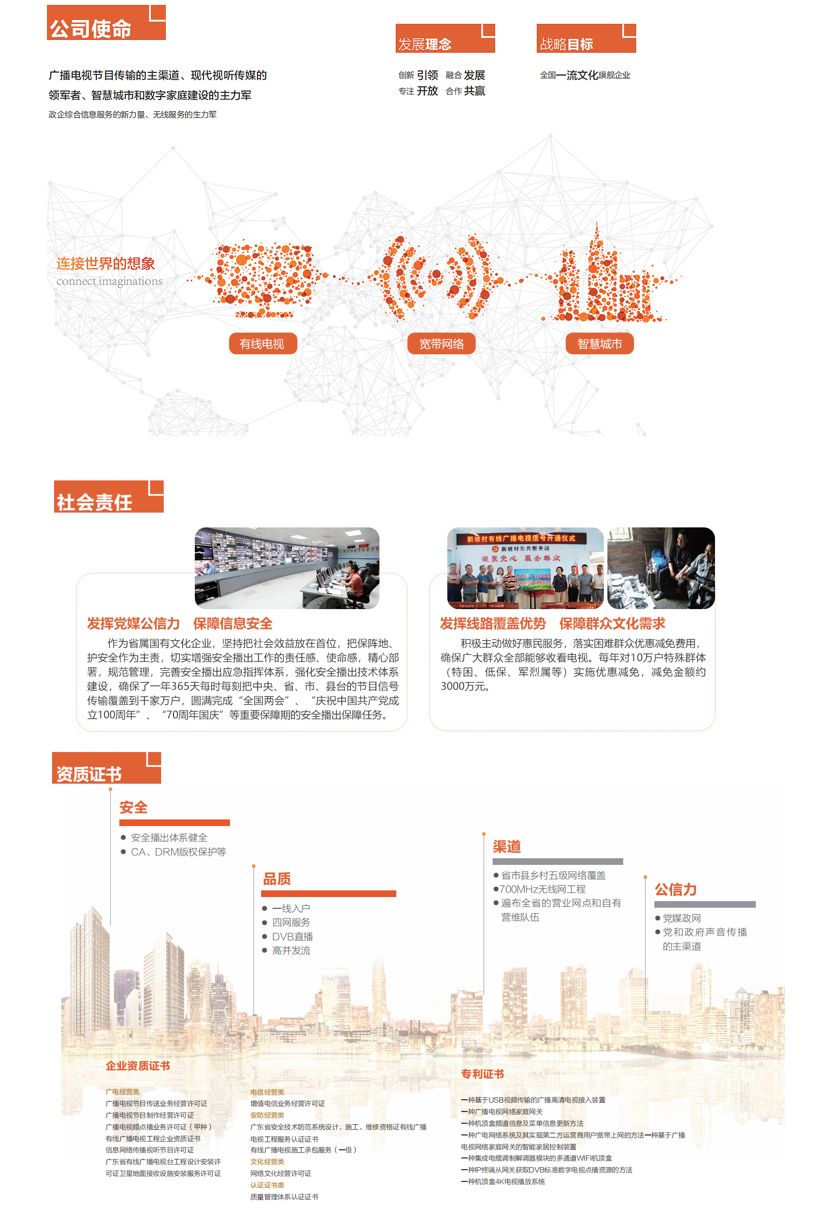 betway西汉姆联官网是凭证中央文化体制刷新精神,经广东省委省政府批准,于2010年建设的大型国有科技型文化企业,是以视频传输为主业、公共信息和5G通讯为特色的现代betway西汉姆联官网网络运营商。2020年经天下一网整合成为中国第四大通讯运营商中国betway西汉姆联官网网络股份有限公司的控股子公司。公司认真广东省内betway西汉姆联官网网络统一妄想、建设、谋划和管理,主营营业包括广播电视节目传输、牢靠电话、综合数据信息、网络视听节目、家庭宽带和5G通讯、工业物联网等,起劲增进智慧betway西汉姆联官网和数字家庭营业转型升级,形成了主业突出、多业并举的生长模式。公司网络信号笼罩全省20个地市、110个县区、1000多万用户。多年来,谋划用户规模、综合实力、工业手艺立异及营业生长能力等均居海内betway西汉姆联官网网络行业前线。2次荣获“天下文化企业30强”,获评为粤港澳大湾区“超等独角兽”企业,多次入选“广东省优异企业”“广东省企业500强”“中国服务企业500强”。